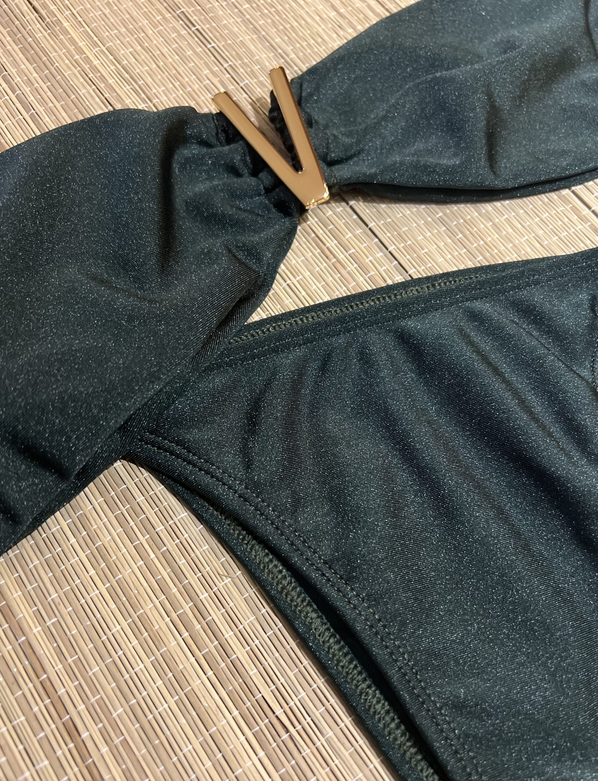 Biquíni tomara que caia com aviamento V dourado , amarração nas costas, confeccionado em lycra Trilobal Beach