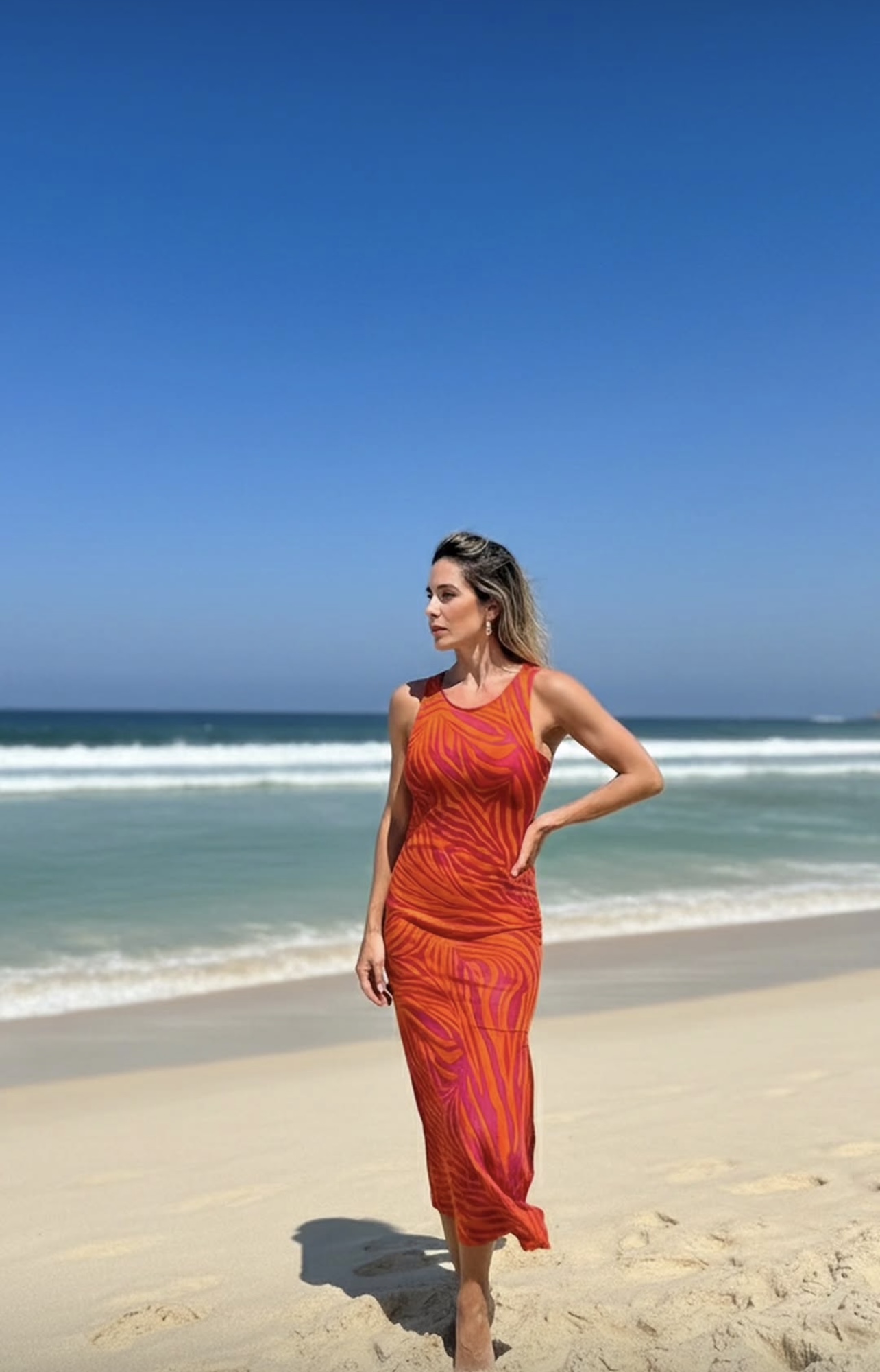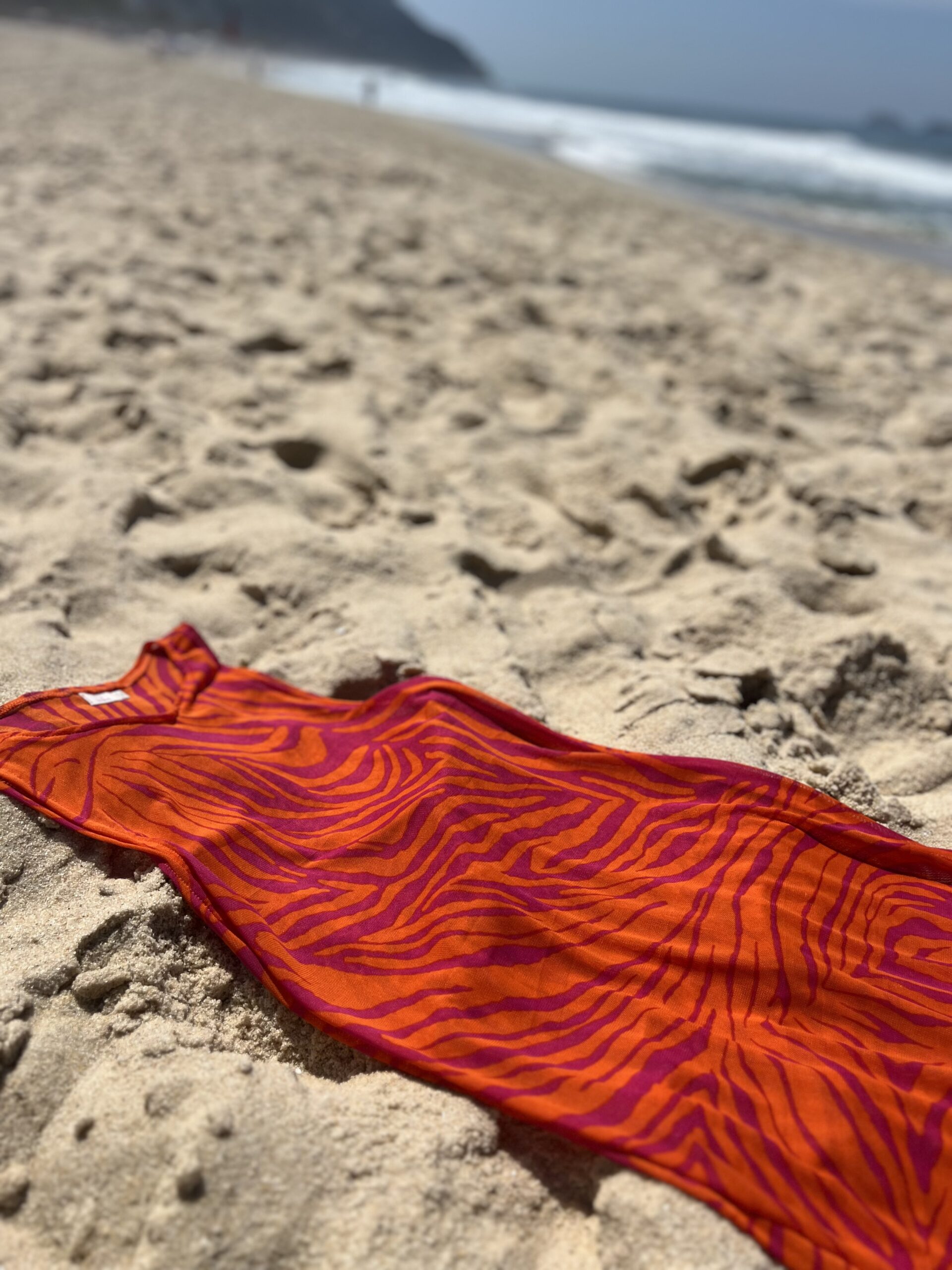 Saída confeccionada com tule estampado nas cores pink e laranja